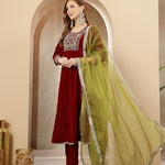Red Solid & Embroidered Velvet Anarkali Kurta Pant Dupatta Set