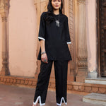 Black Lace Detail Short Kurti With Palazzos, in Poly Viscose fabric, Unlined, Short Lenght / Ankle Length, Comfort Fit, Button Closure / Elasticated Waistband, Straight Hemline and features Lace Attachment At Sleeve Opening & Pant Hem