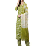Cotton Calf Length Straight 3/4 Sleeve Round Neck Printed Kurta, Pants With Dupatta Set