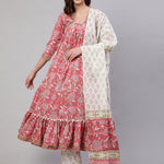 Cotton Printed Ankle Length Flared 3/4 Sleeve V Neck Kurta, Pants With Dupatta Set
