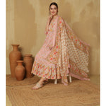 Women Cotton Printed Ankle Length Round Neck Anarkali Kurta, Palazzo With Dupatta Set