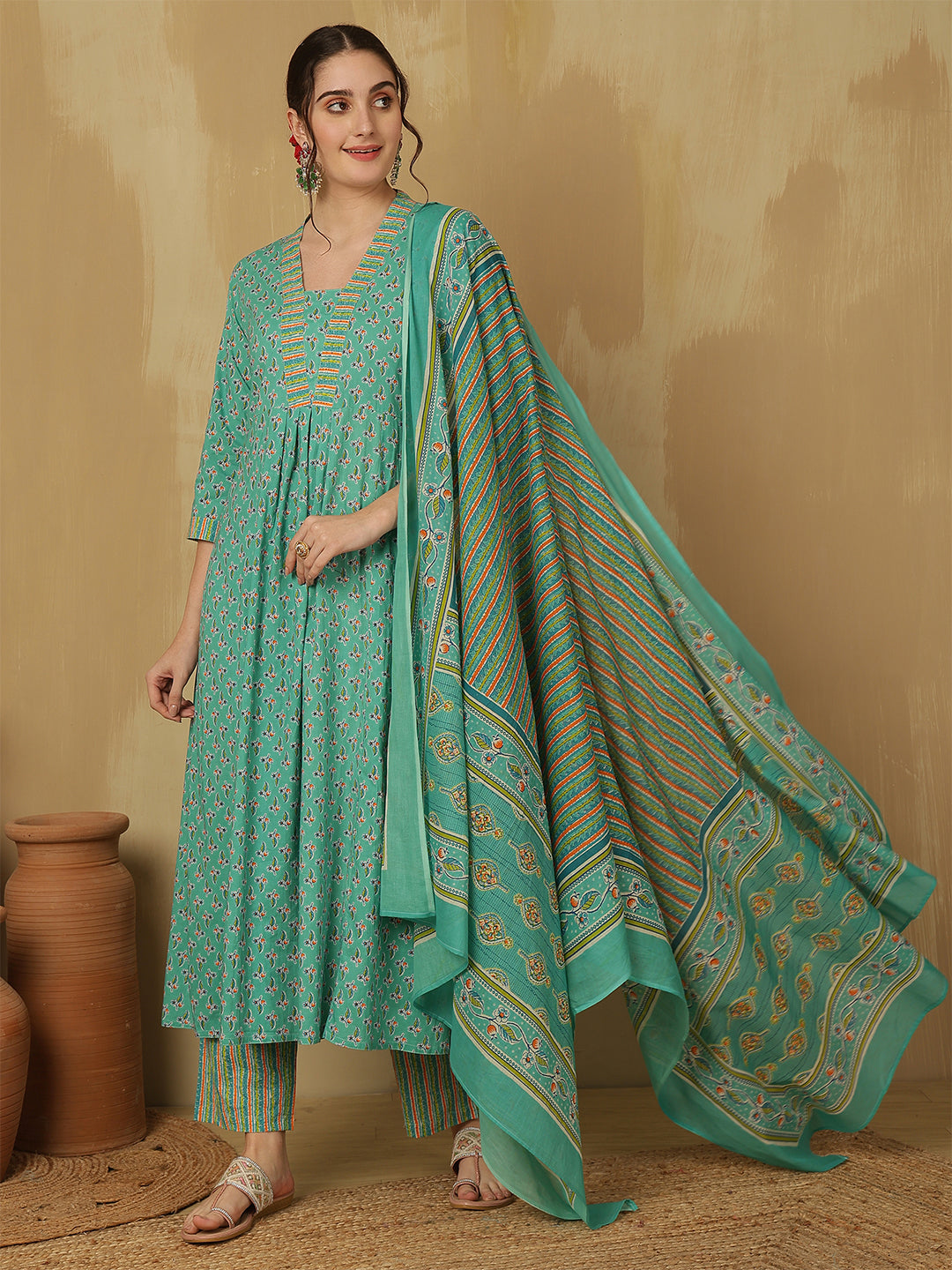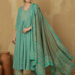 Women Cotton Printed Ankle Length V-Neck Anarkali Kurta, Palazzo With Dupatta Set