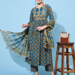 Cotton Calf Printed Semi-Flared 3/4 Sleeve Round Neck Kurta Bottom Dupatta Set