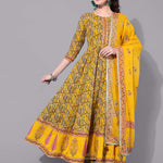Cotton Printed Calf Length Flared 3/4 Sleeve Round Kurta Bottom Dupatta Set