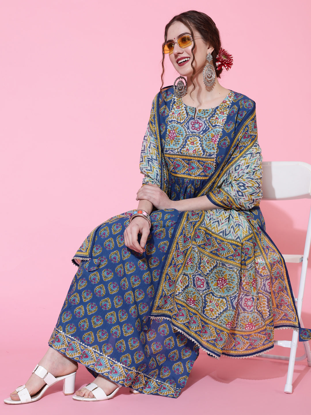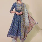 Cotton Printed Calf Length Semi-Flared 3/4 Sleeve Round Kurta Bottom Dupatta Set