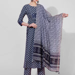 Cotton Calf Length Printed Semi-Flared 3/4 Sleeves Round Neck Kurta Bottom Dupatta Set