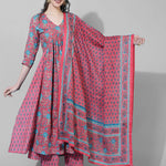 Cotton Calf Length Printed Semi-Flared 3/4 Sleeves V-Neck Kurta Bottom Dupatta Set