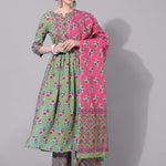 Cotton Calf Printed Semi-Flared 3/4 sleeves Round Neck Kurta Bottom Dupatta Set