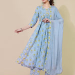 Cotton Calf Printed Semi-Flared 3/4 sleeves V-Neck Kurta Bottom Dupatta Set