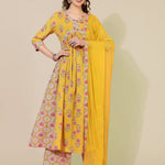 Cotton Calf Printed Semi-Flared 3/4 sleeves V-Neck Kurta Bottom Dupatta Set