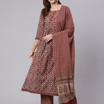 Cotton Calf Length Printed Semi Flared 3/4 Sleeve Round Neck Kurta Bottom Dupatta Set