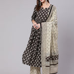 Rayon Calf Length Printed Flared 3/4 Sleeve Round Neck Kurta Bottom Dupatta Set