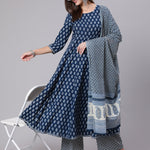 Cotton Calf Length Printed Flared 3/4 Sleeve Round Neck Kurta Bottom Dupatta Set