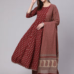 Cotton Calf Length Printed Flared 3/4 Sleeve Round Neck Kurta Bottom Dupatta Set