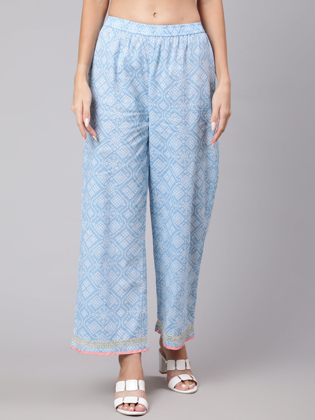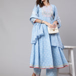 Cotton Calf Length Bandhni Print Flared 3/4 Sleeve Round Neck Kurta Bottom Dupatta Set