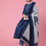 Cotton Calf Length Printed Semi Flared 3/4 Sleeve Round Neck Kurta Bottom Dupatta Set
