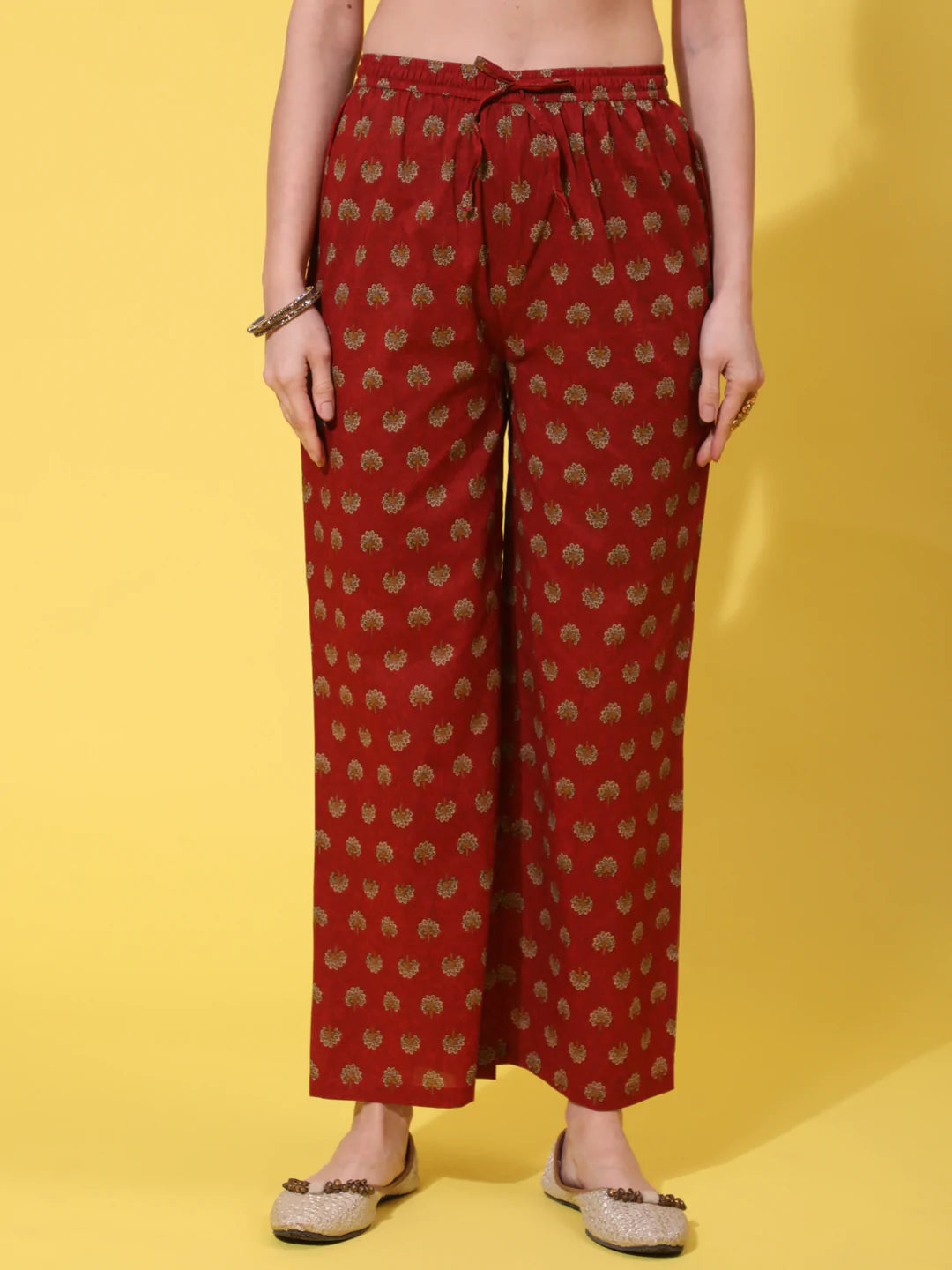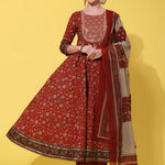 Cotton Calf Length Printed Flared 3/4 Sleeve Round Neck Kurta Bottom Dupatta Set