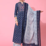 Cotton Calf Length Printed Semi Flared 3/4 Sleeve Collar Neck Kurta Bottom Dupatta Set