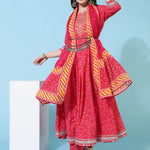 Cotton Calf Length Flared 3/4 Sleeve Printed Round Neck Kurta Bottom Dupatta Set