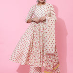 Cotton Calf Printed Flared 3/4 Sleeve Round Kurta Bottom Dupatta Set