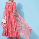 Cotton Calf Length Printed Flared 3/4 sleeves Round Kurta Bottom Dupatta Set