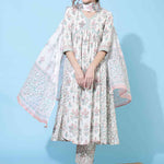 Cotton Calf Length Printed Flared 3/4 sleeves V neck Kurta Bottom Dupatta Set