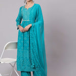 Rayon Calf Length Printed Semi Flared 3/4 Sleeve Round Neck Kurta Pant Dupatta Set