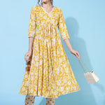 Cotton Calf Length Printed Flared 3/4 Sleeve V-Neck Kurta Bottom Set