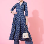 Cotton Calf Length Printed Flared 3/4 Sleeve Collar Kurta Bottom Set