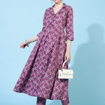Cotton Calf Length Printed Flared 3/4 Sleeve Collar Kurta Bottom Set