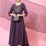 Cotton Calf Length Printed Flared 3/4 Sleeve Round Kurta Bottom Dupatta Set