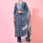 Cotton Calf Length Printed Straight 3/4 Sleeves Round Kurta Bottom Dupatta Set