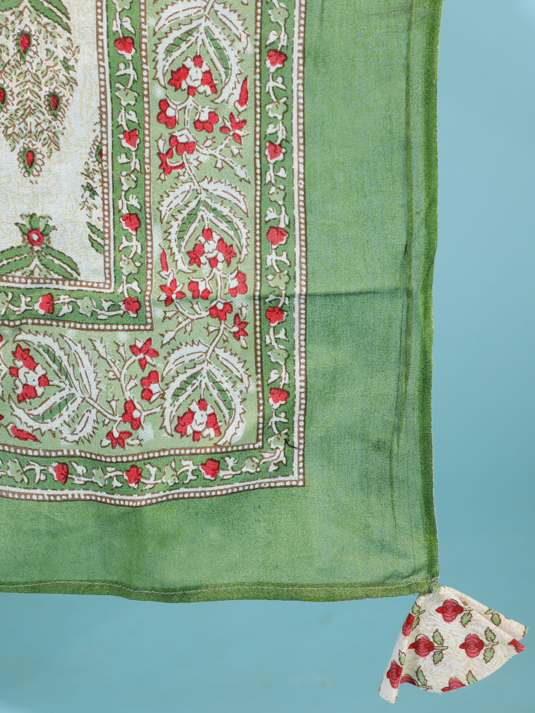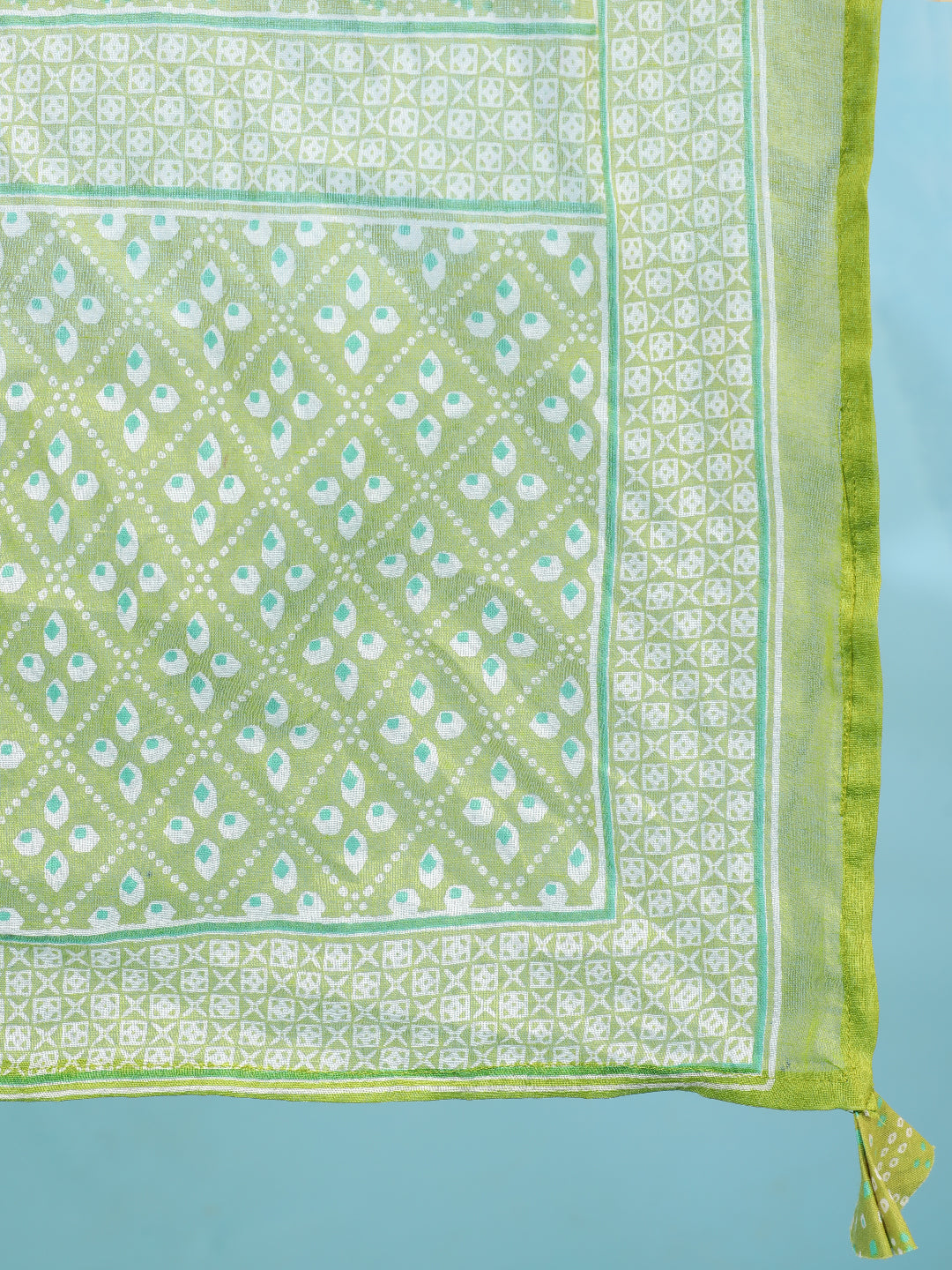 Cotton Calf Length Printed Flared 3/4 Sleeves V-Neck Kurta Bottom Dupatta Set