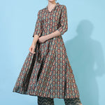 Cotton Calf Length Printed Flared 3/4 Sleeves Collar Kurta Bottom Set