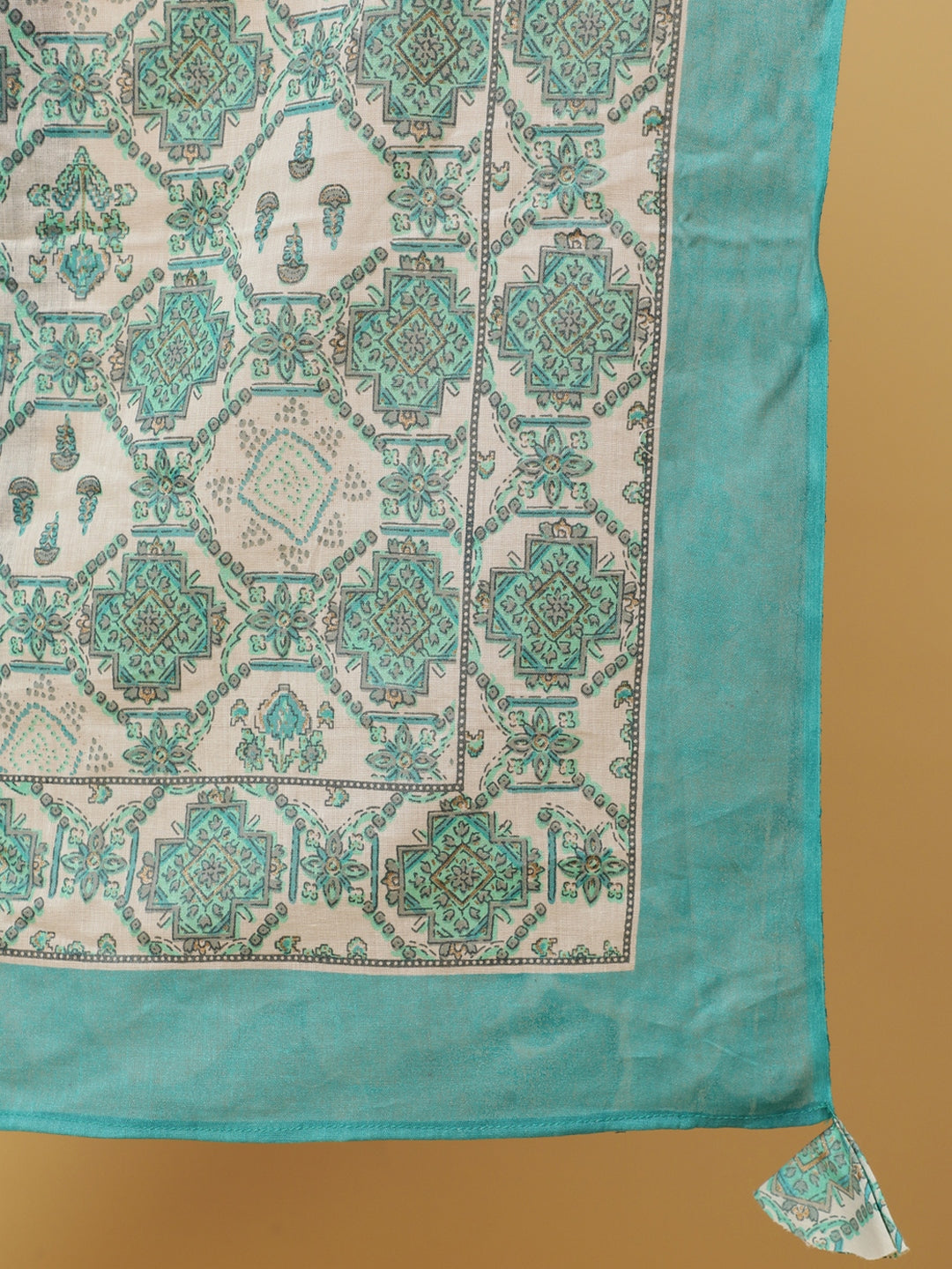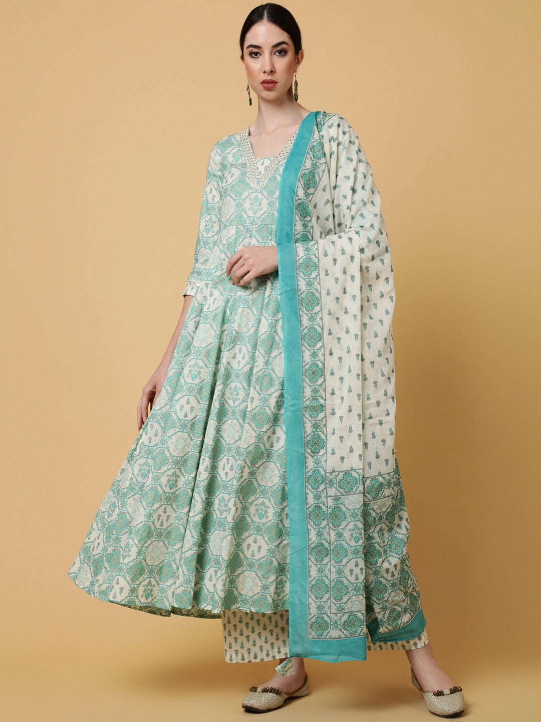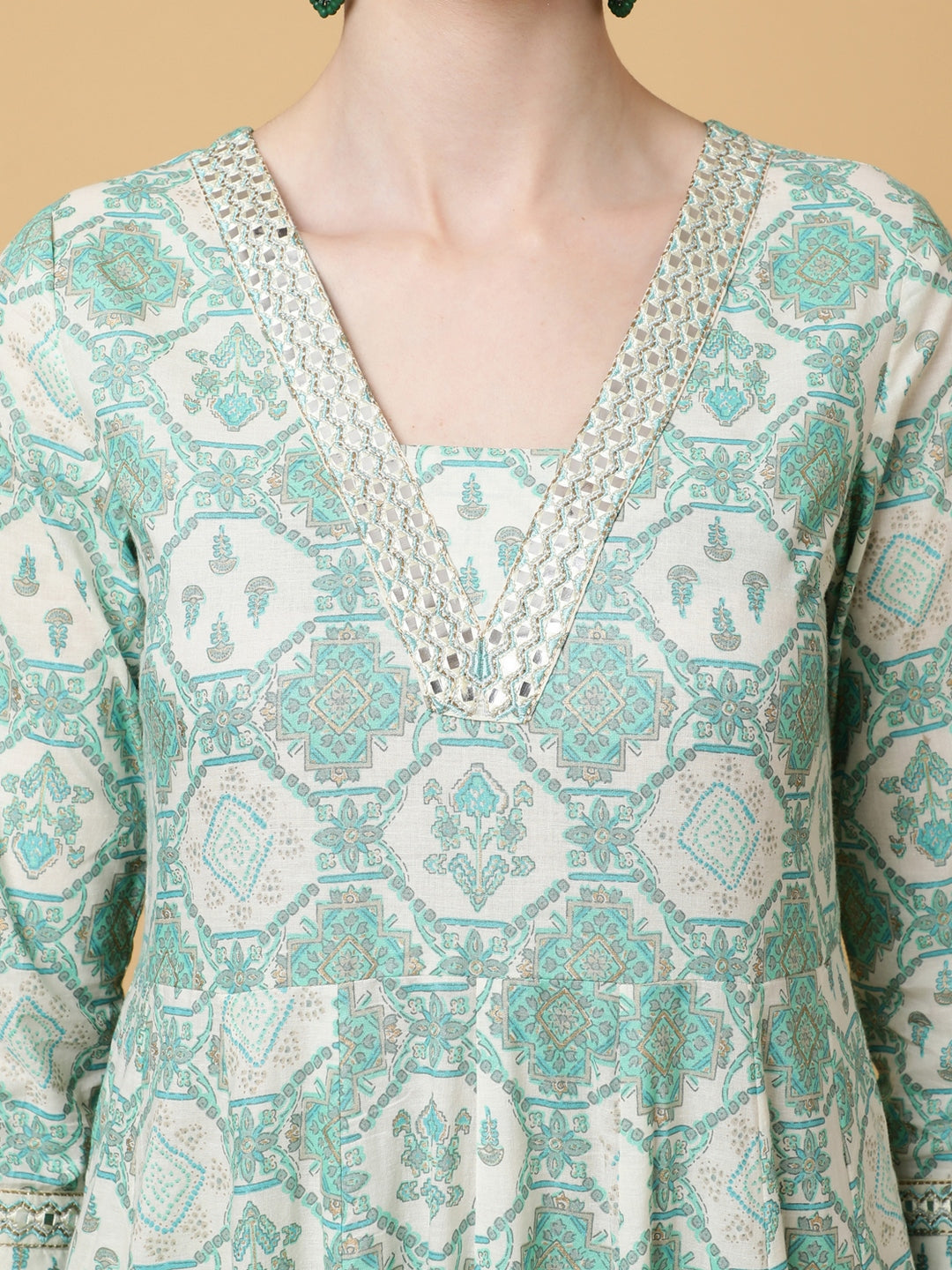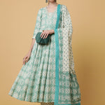 Cotton Calf Length Printed Flared 3/4 Sleeves V-Neck Kurta Bottom Dupatta Set