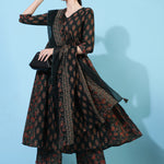 Cotton Calf Length Printed Flared 3/4 Sleeves V-Neck Kurta Bottom Dupatta Set