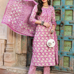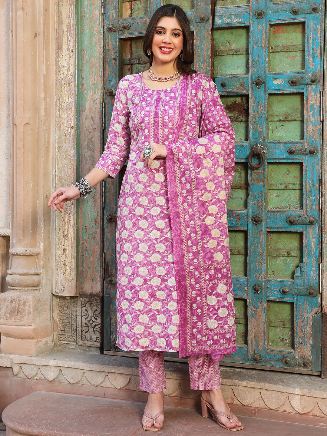 Cotton Calf Length Printed Straight 3/4 Sleeves Round Kurta Bottom Dupatta Set