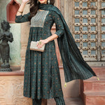 Rayon Calf Length Printed Semi-Flared 3/4 Sleeves Round Kurta Bottom Dupatta Set