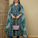 Cotton Calf Length Semi-Flared 3/4 Sleeves V Kurta Bottom Dupatta Set