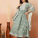 Cotton Calf Length Semi-Flared 3/4 Sleeves Round Kurta Bottom Dupatta Set