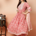 Cotton Calf Length Semi-Flared 3/4 Sleeves Round Kurta Bottom Dupatta Set
