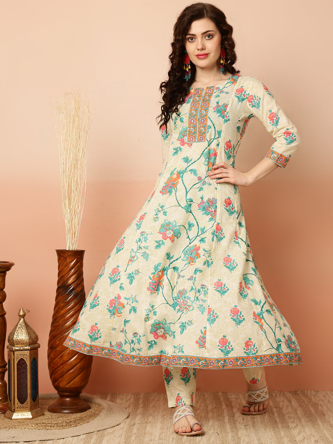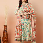 Cotton Calf Length Semi-Flared 3/4 Sleeves Round Kurta Bottom Dupatta Set