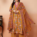 Cotton Calf Length Semi-Flared 3/4 Sleeves V Kurta Bottom Dupatta Set