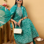 Cotton Calf Length Bandhani Flared 3/4 Sleeves Round Neck Kurta Bottom Dupatta Set