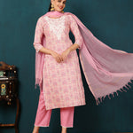 Cotton Knee Length Motif Straight 3/4 Sleeves Round Neck Kurta Bottom Dupatta Set