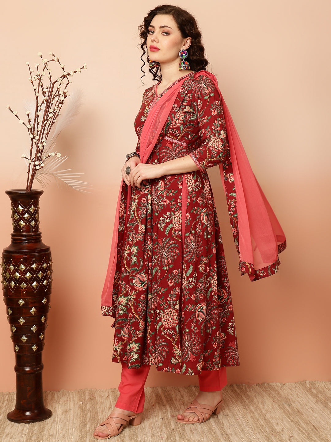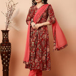Cotton Calf Length Semi-Flared 3/4 Sleeves V Kurta Bottom Dupatta Set
