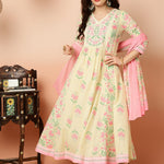 Cotton Calf Length Flared 3/4 Sleeves V Kurta Bottom Dupatta Set