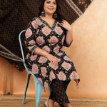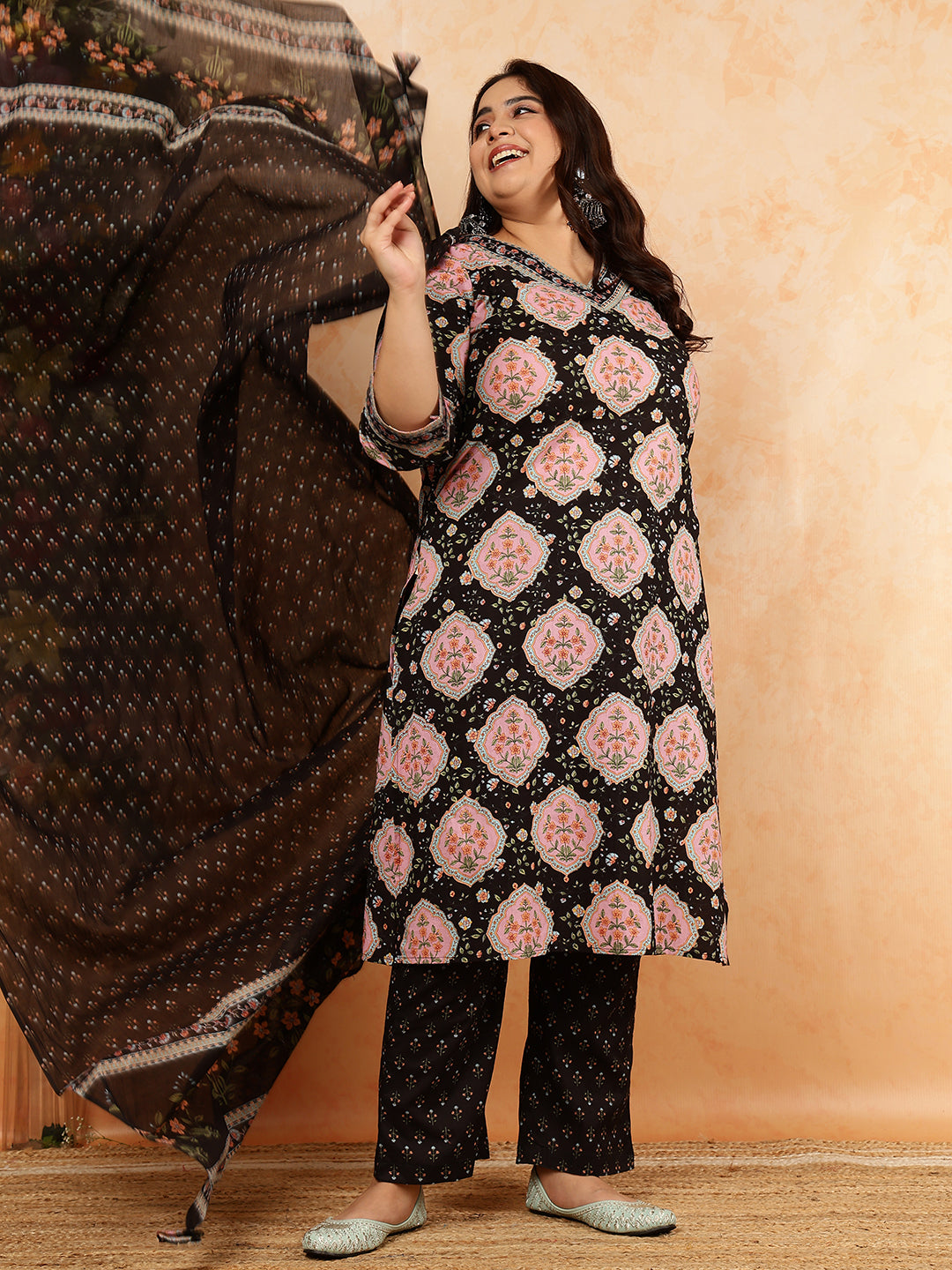 Cotton Calf Length Printed Straight 3/4 Sleeves V-Neck Kurta, Bottom With Dupatta