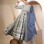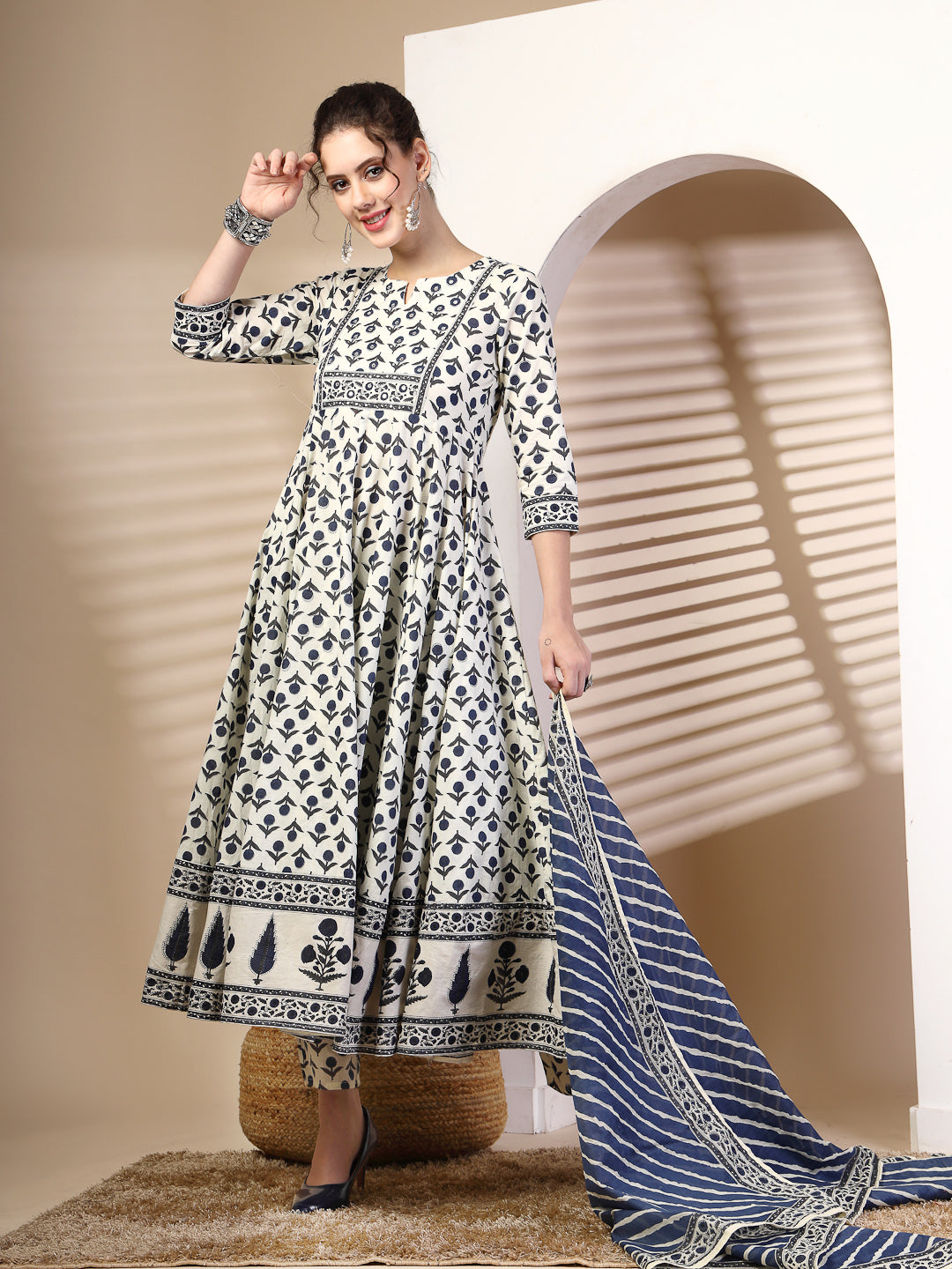 Cotton Calf Length Printed Flared 3/4 Sleeves Round Neck Kurta, Bottom With Dupatta