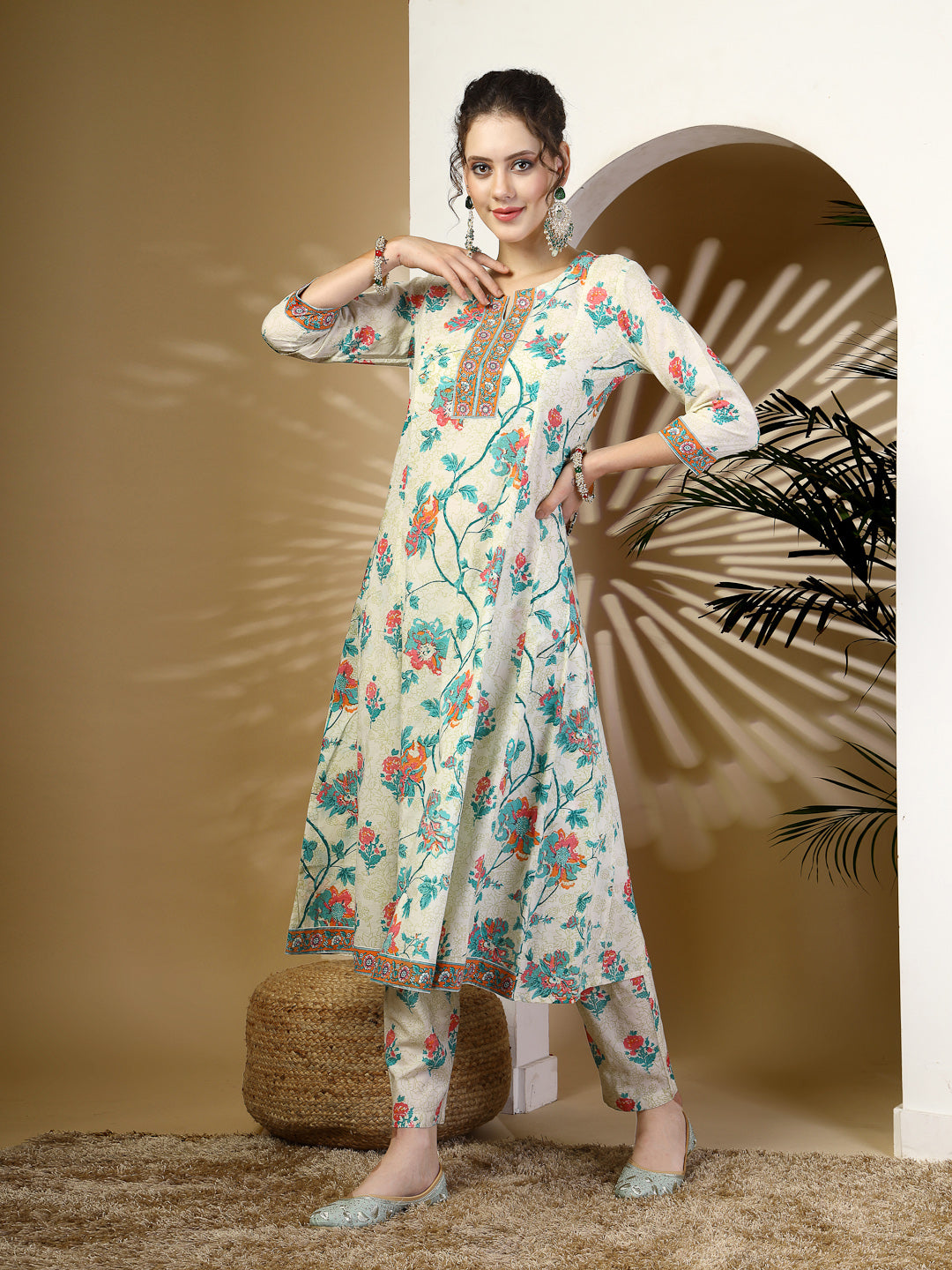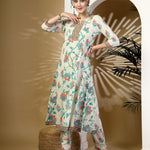 Cotton Calf Length Printed Flared 3/4 Sleeves Round Neck Kurta, Bottom With Dupatta